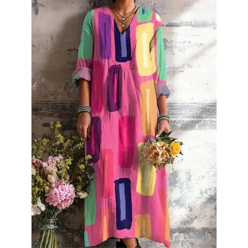 Easter Women’s Midi Dress Sundress A Line Dress Vacation Casual Boho Going out Beach Loose Fit Floral Graphic Geometric Long Sleeve V Neck Yellow Pink Orange Green Summer Spring Fall Winter