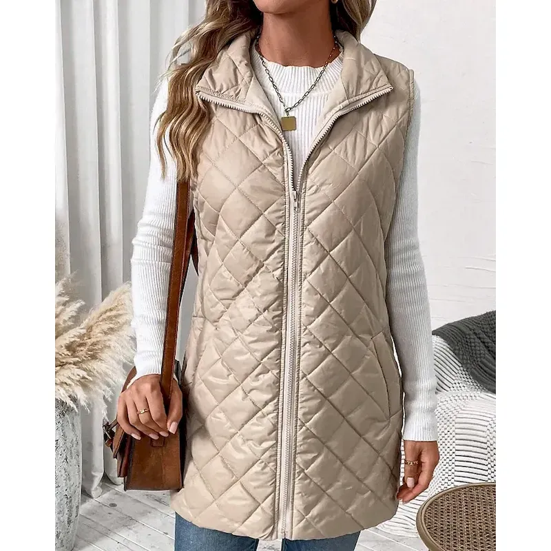 Women’s Vest Warm Comfortable Zipper Pocket Outdoor Casual Plain Holiday Weekend Zipper Long Stand Collar Regular Fit Sleeveless Outerwear Black Apricot Winter